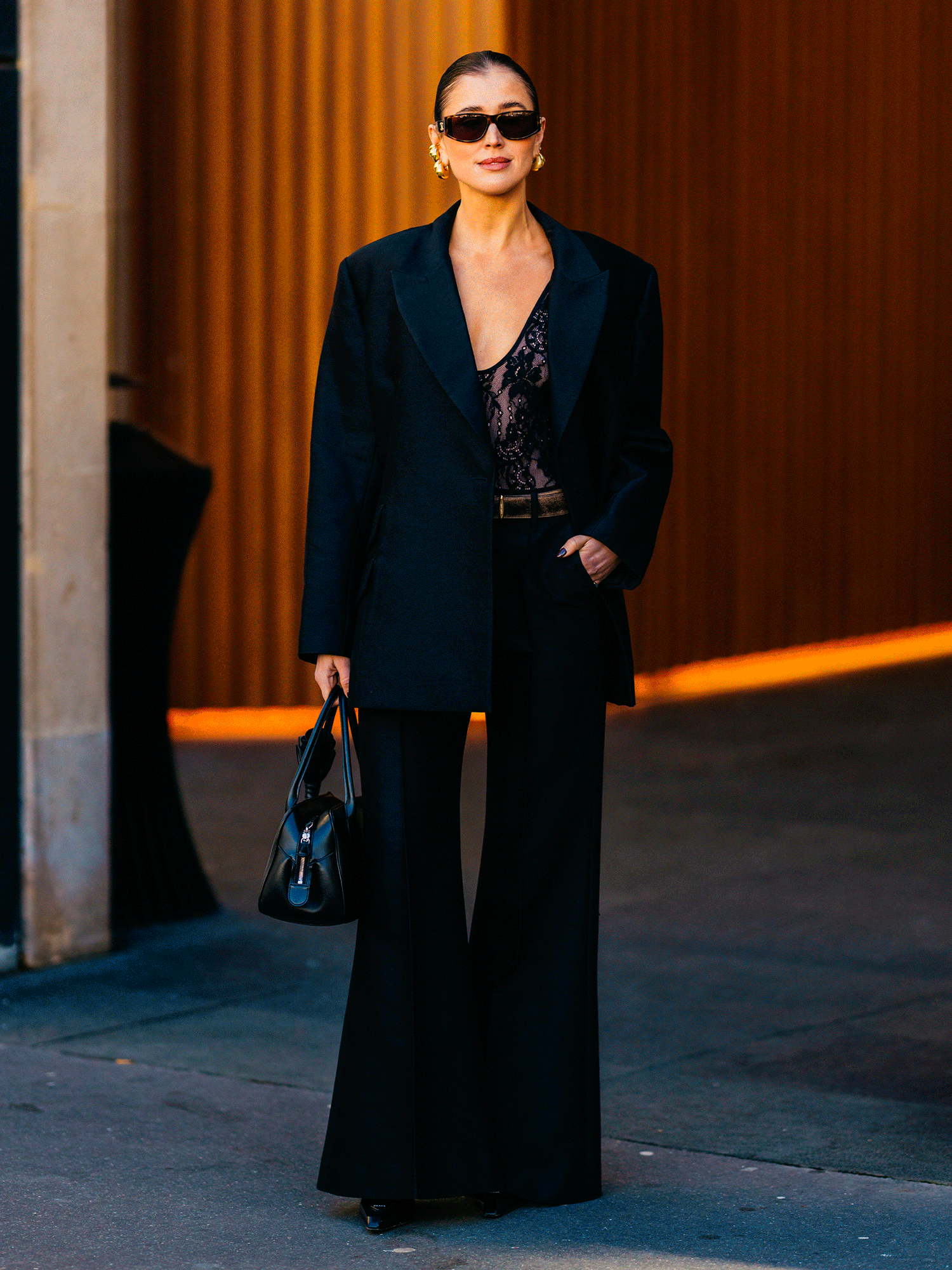Čipkasti top ispod strukturiranog sakoa diskretno proviruje i daje outfitu teksturu bez pretjerivanja.